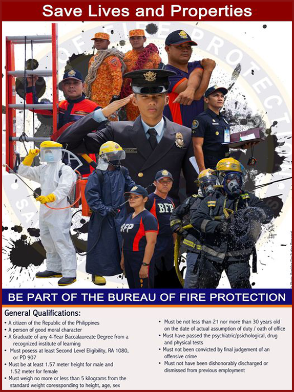 We commit to prevent and suppress destructive fires, investigate its causes; enforce Fire Code and other related laws; respond to man-made and natural disasters and other emergencies.